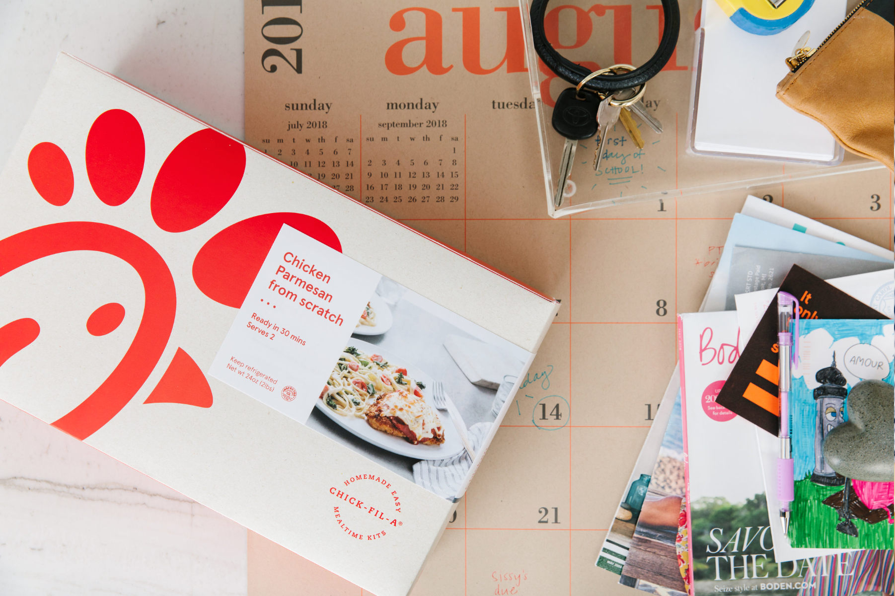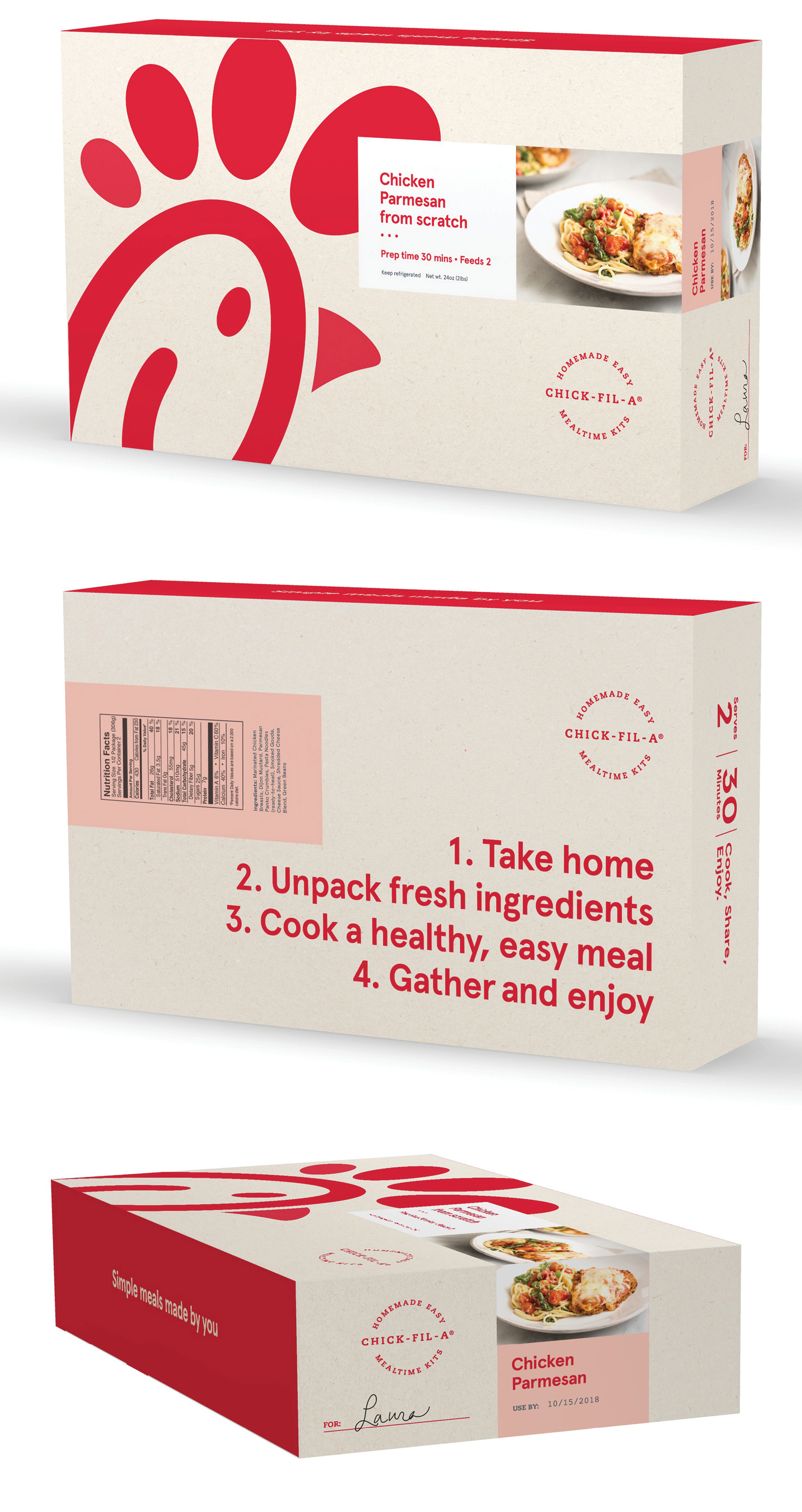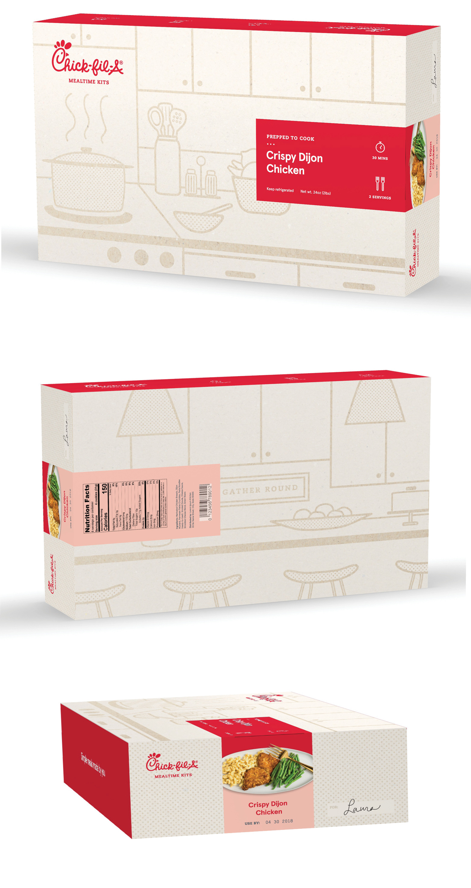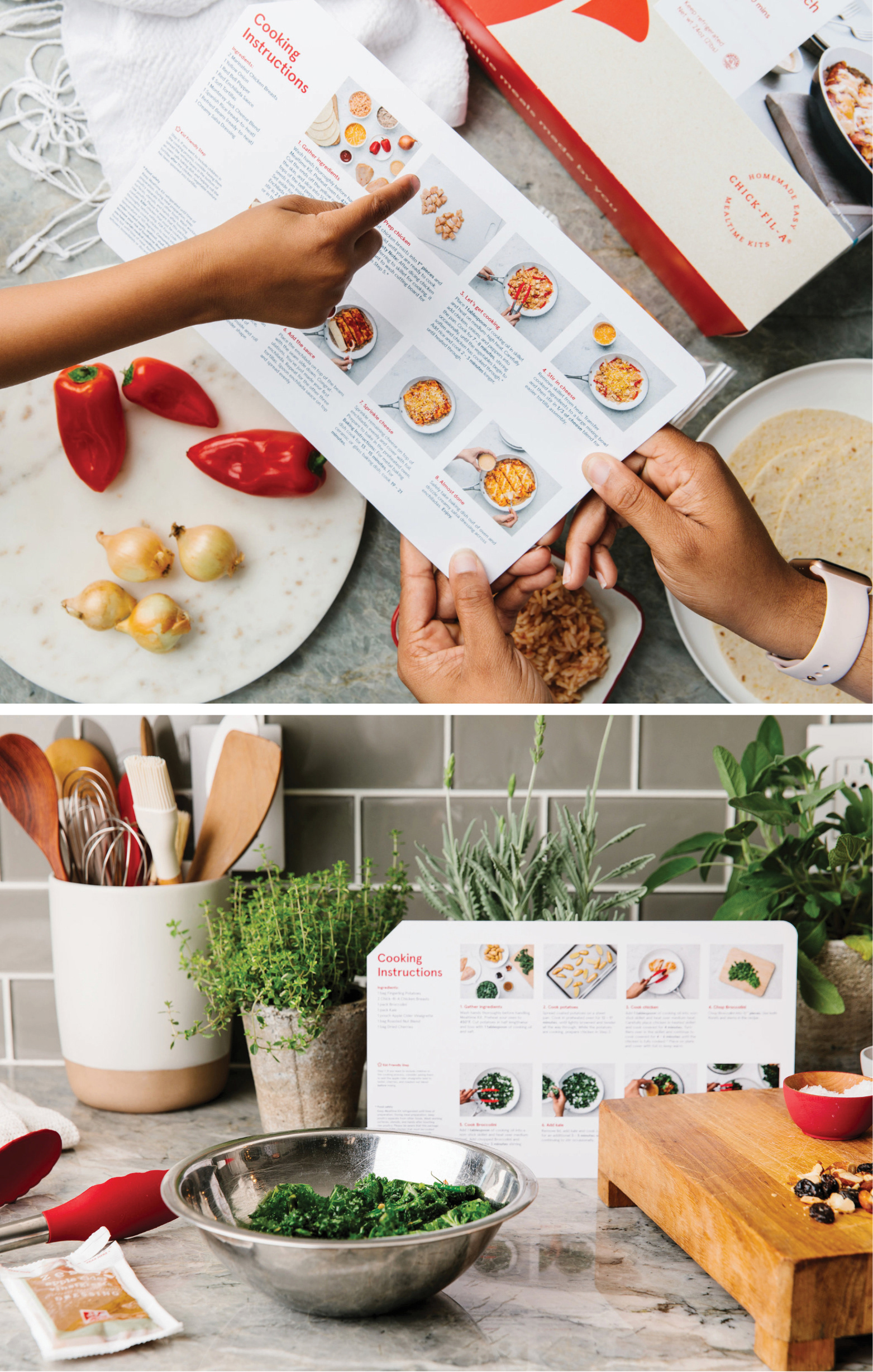 A consumer product including raw pre-portioned ingredients and recipe card designed for consumers to prepare a craveable meal at home. The meal does not require in-restaurant preparation or in-restaurant cooking and can be made in 30 minutes or less. They wanted the design to be approachable and definitively Chick-fil-A.