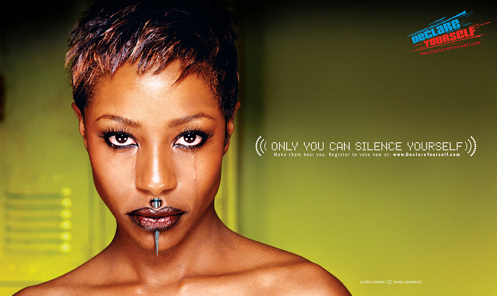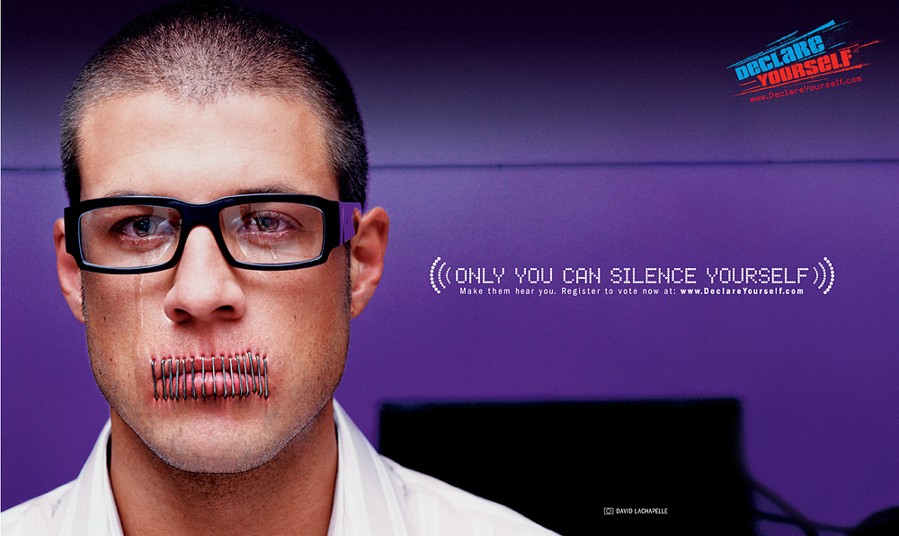 To encourage voter registration among youth for the 2008 presidential election, Declare Yourself chose a bondage-themed print advertising campaign. The ads include models and celebrities, Christina Aguilera, Jonathan Bennett, La Toya London and André 3000. The various forms of bondage is a symbol of reducing one's voice by not registering as a voter. Only you can silence yourself.