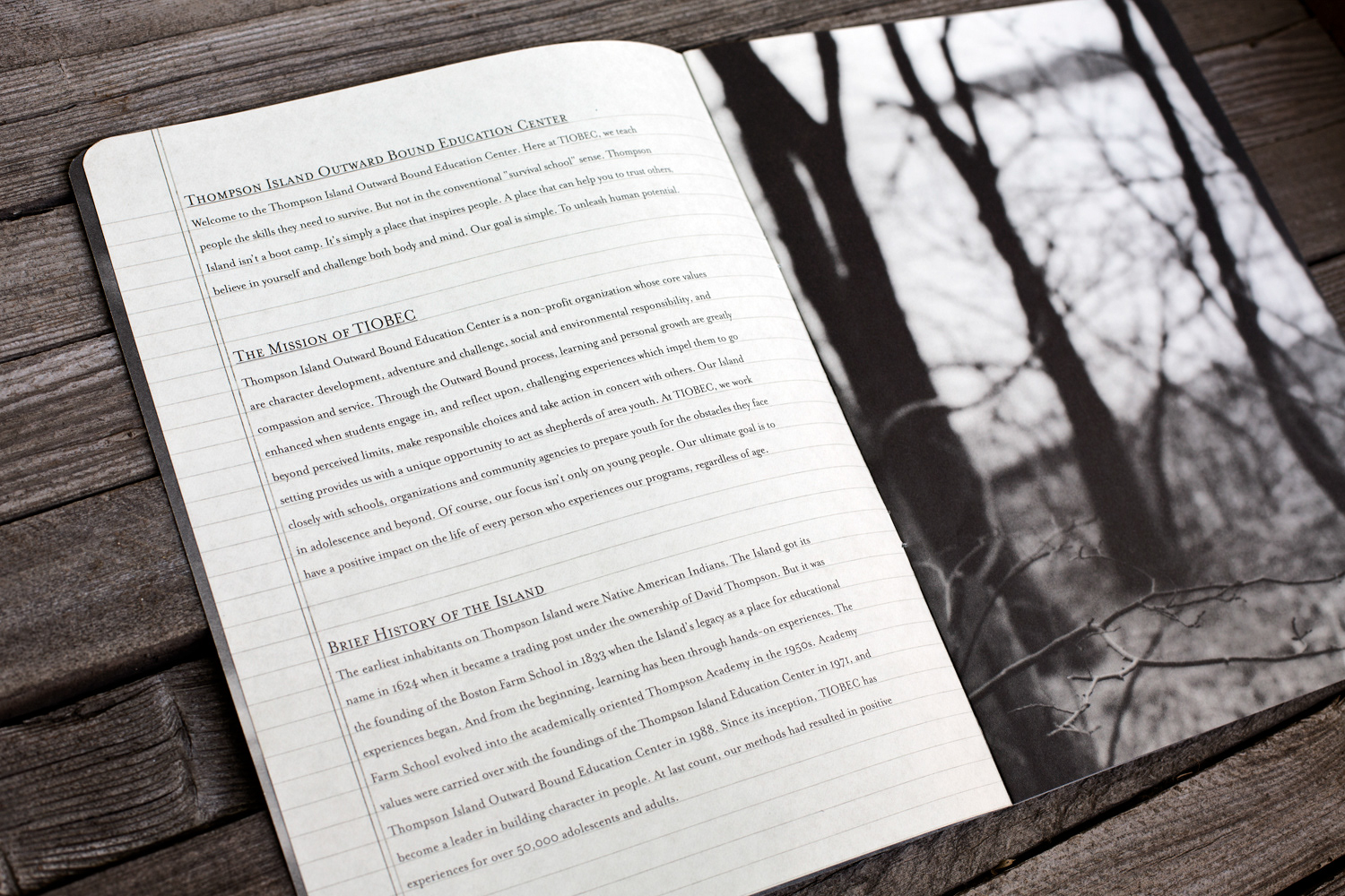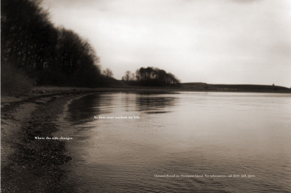 For more than 60 years, Outward Bound has been delivering adventure and challenge-based courses to youth worldwide. Thompson Island, located just off the coast of Boston, Massachusetts is an unique location, where they use the wilderness as their classroom, guiding students through a journey of self-discovery. This work helped them promote their program and also picked up a New England Hatch Award. Photographer: John Curtis / Copywriter: Mike Piro
